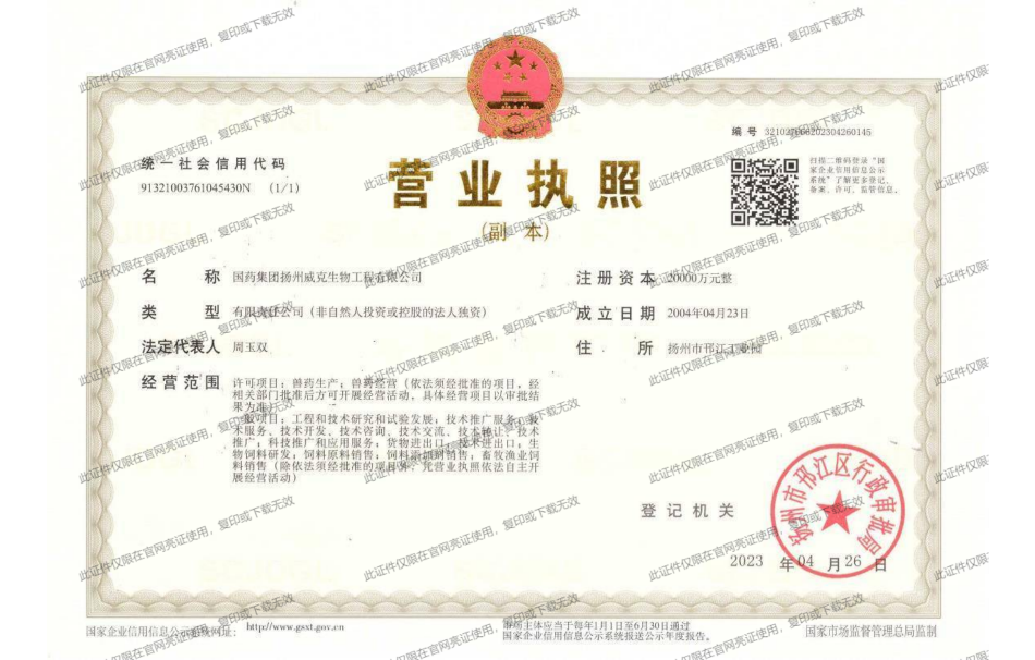 国药集团扬州威克生物工程有限公司(以下简称“扬州威克”)成立于2004年,公司注册资本为人民币2亿元,是国家高新技术企业,江苏省“专精特新”中小企业。 公司座落于扬州市高新技术开发区,占地面积近5万平方米。 拥有活疫苗、灭活疫苗综合车间两个生产车间, 八条生产线, 拥有41个疫苗产品的生产文号,其中禽流感灭活疫苗(H9亚型)、鸡传染性法氏囊病中等毒力活疫苗和高致病性猪蓝耳病活疫苗产品先后被国家科技部等四部委授予国家重点新产品称号。