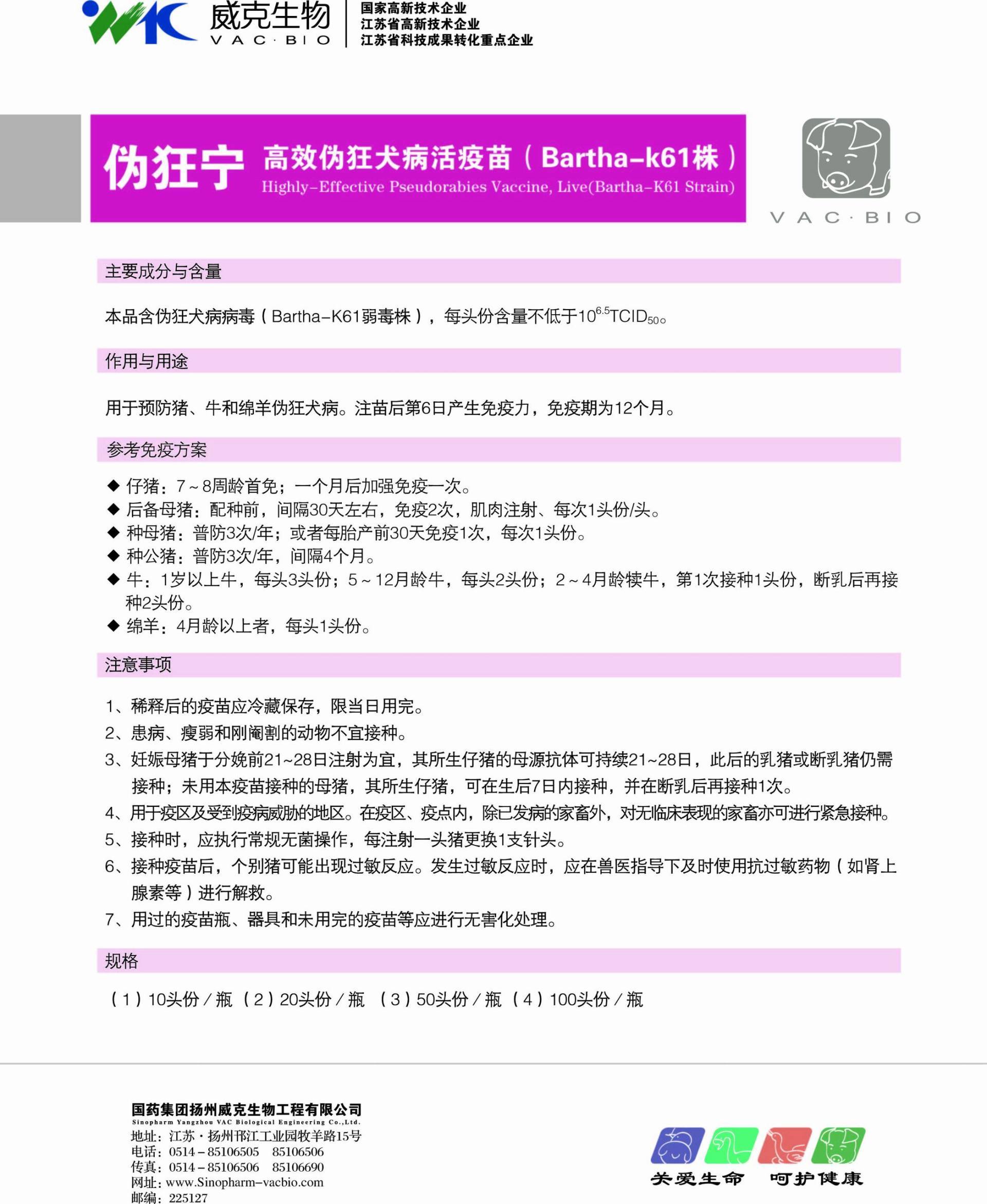 【主要成分与含量】本品含伪狂犬病病毒(Bartha-K61弱毒株),每头份含量不低于106.5TCID50
