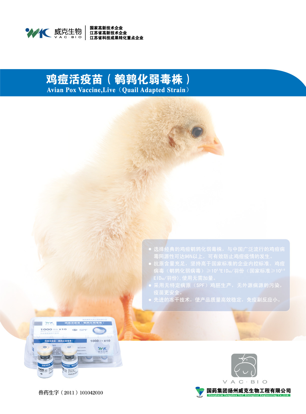 ◆抗原含量充足,坚持高于国家标准的企业内控标准。鸡痘病毒(鹌鹑化弱病毒)≥103.5EID50/羽份(国家标准≥103.0EID50/羽份),使用无需加量。