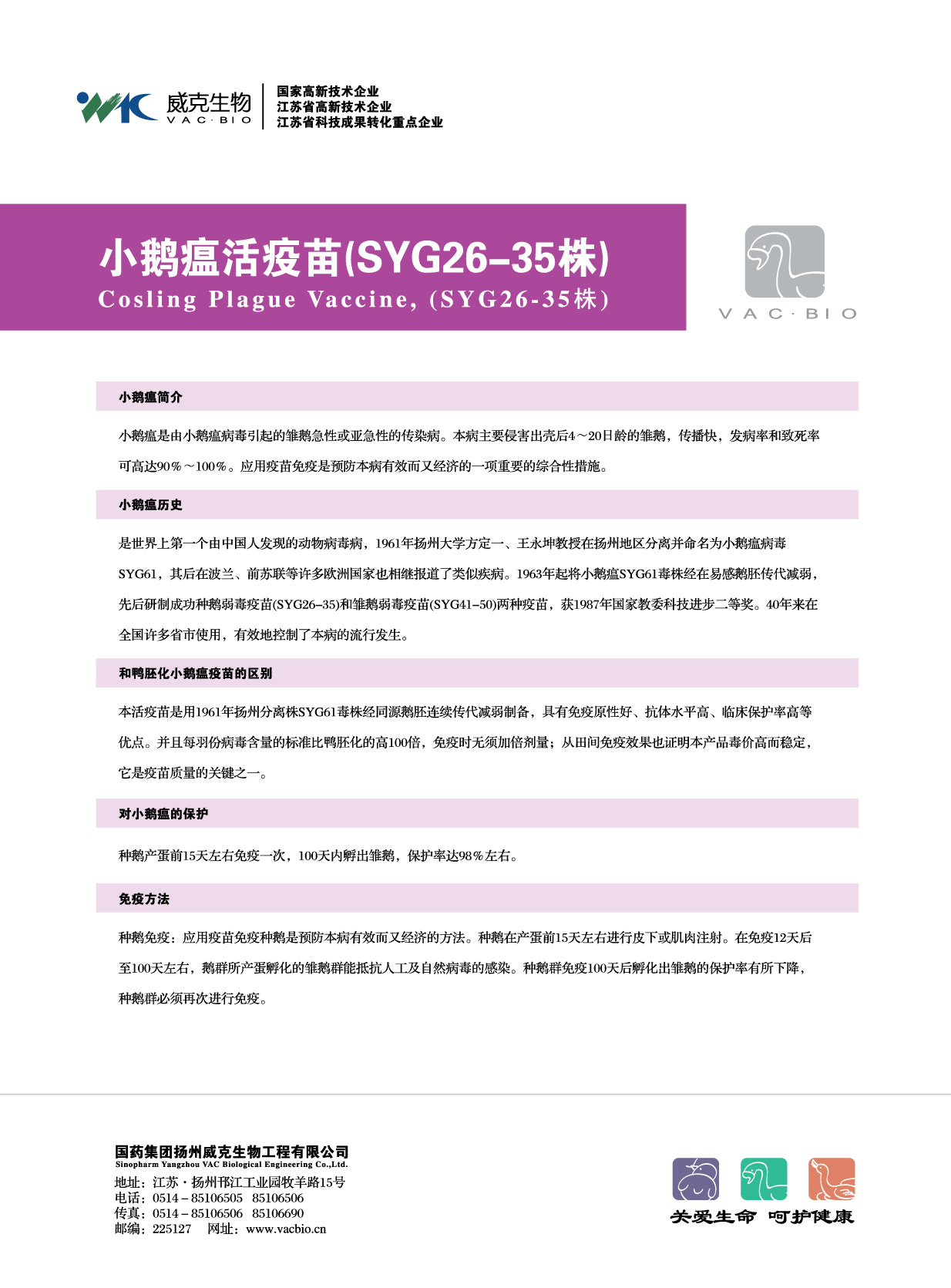 【主要成分与含量】 含小鹅瘟病毒(SYG26-35 株)至少105.0ELD50/羽份。