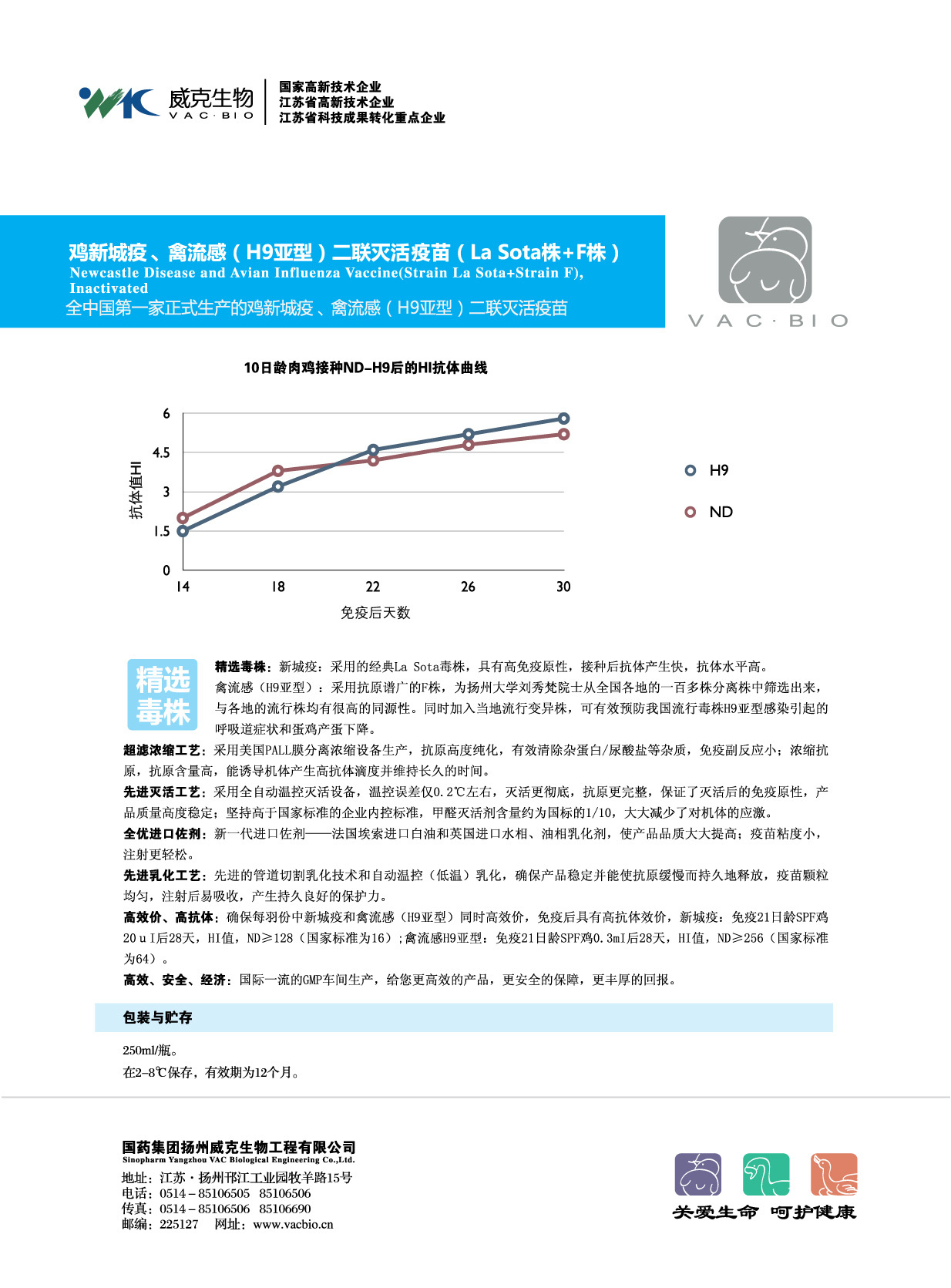 通用名 鸡新城疫、禽流感(H9亚型)二联灭活疫苗(La Sota株+F株)
