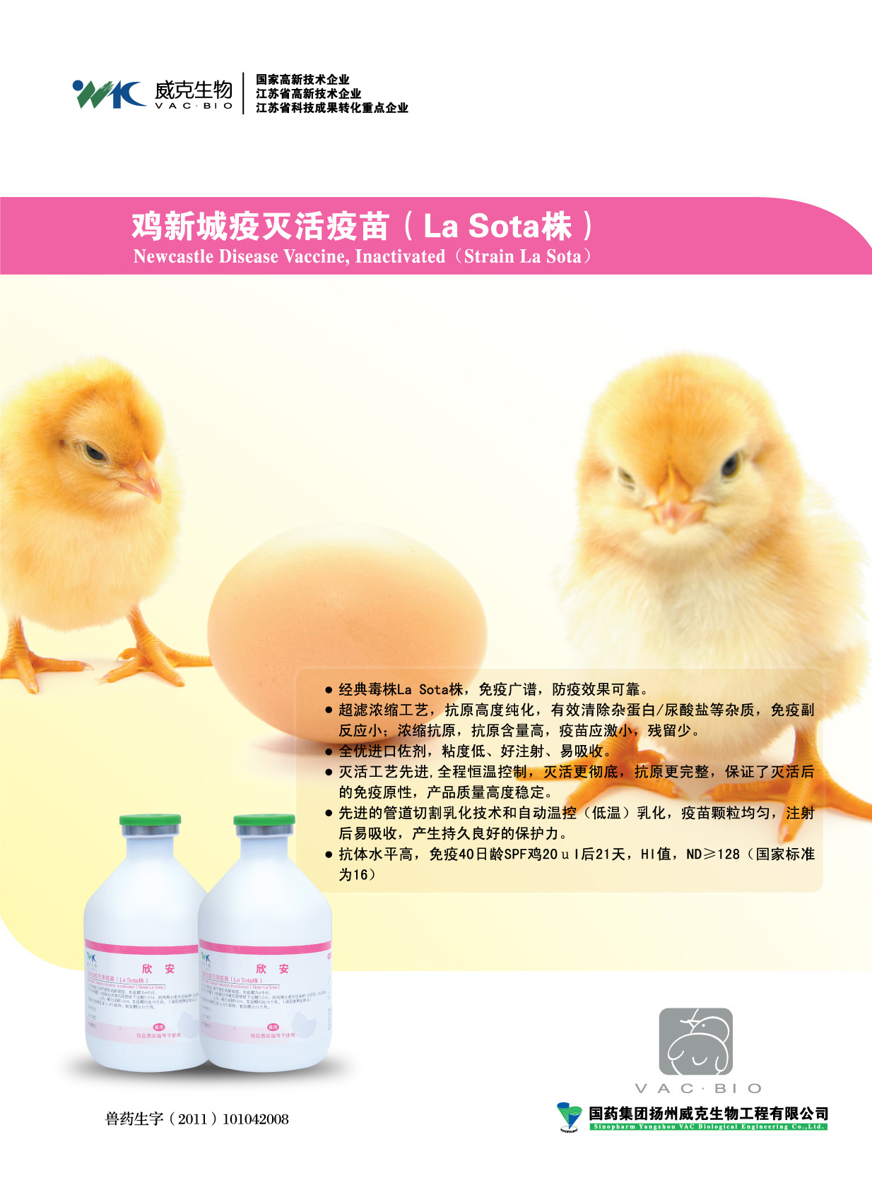 含灭活的鸡新城疫病毒(La Sota 株),灭活前的病毒含量不少于108.5EI D50/0.1ml。