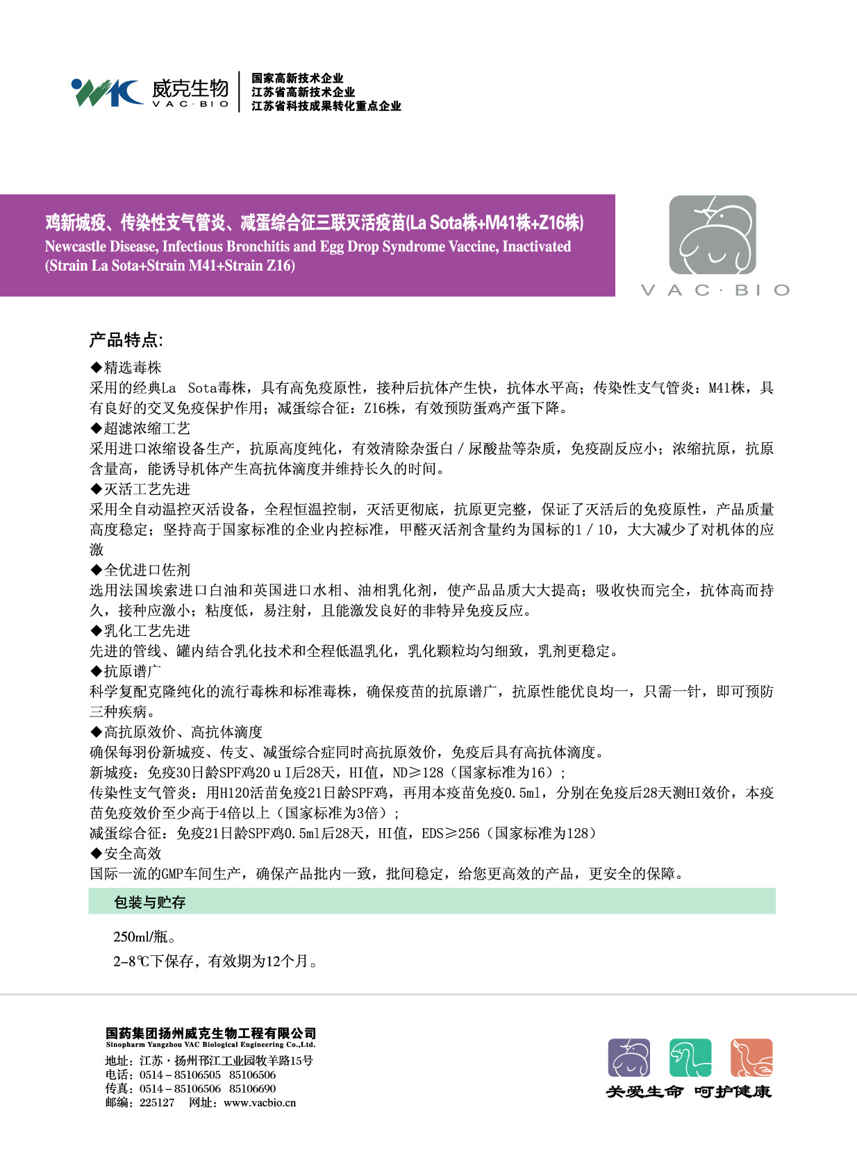 鸡新城疫﹑传染性支气管炎﹑减蛋综合征三联灭活疫苗 (La Sota株+M41株+Z16株)