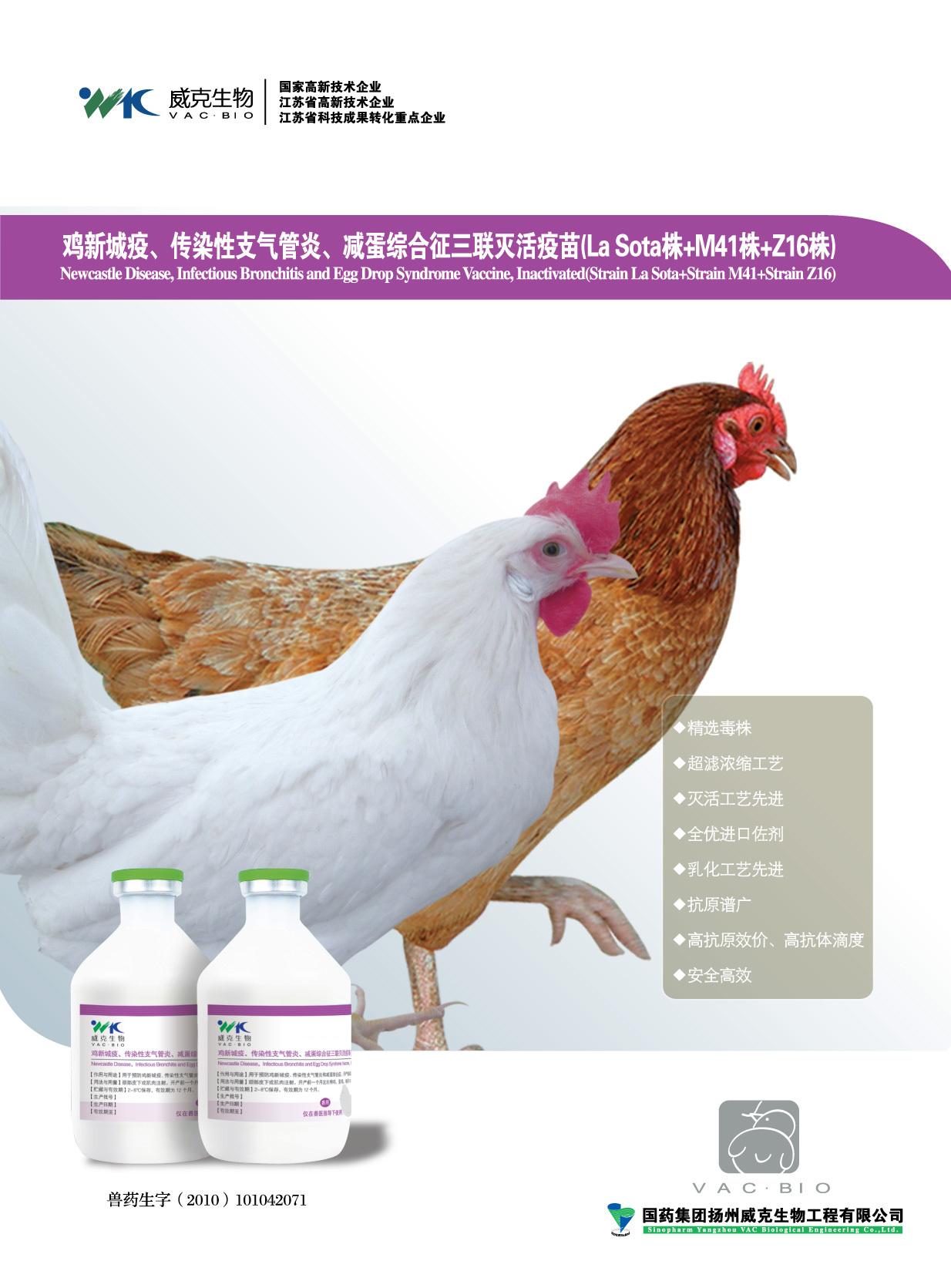 疫苗中含灭活的鸡新城疫病毒La Sota株、传染性支气管炎病毒M41株和减蛋综合征病毒Z16株,灭活前的鸡新城疫病毒含量≥108.5EID50/0.1ml,传染性支气管炎病毒含量≥106.5EID50/0.1ml,减蛋综合征病毒含量≥106.5EID50/0.1ml。