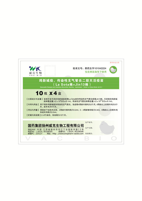 通用名 鸡新城疫、传染性支气管炎二联灭活疫苗(LaSota株+Jin13株)