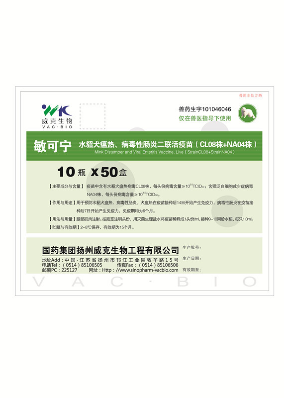 英文名 Mink Distemper and Viral Enteritis Vaccine, Live(strainCL08+strainNA04)